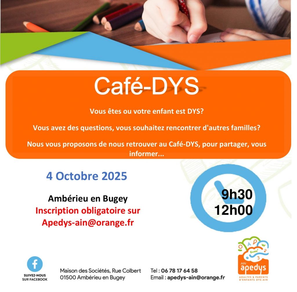 pour finir l’année, nous vous proposons deux cafés-DYS, l’un à Ambérieu de 9h30 à 12h00 et l’autre, à Bourg, ATTENTION, de 14h00 à 16h30.